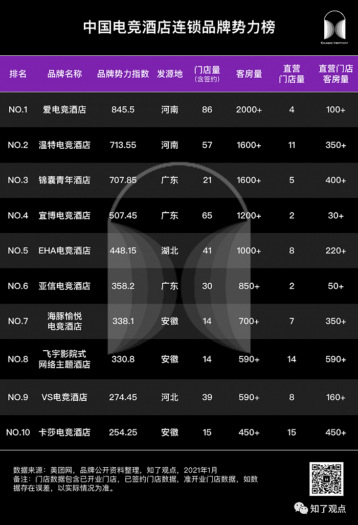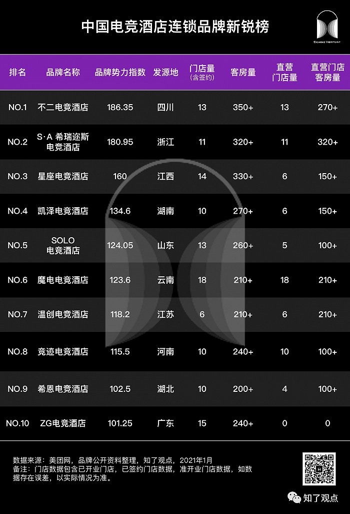 截至2021年1月,知了君通过统计归纳市场上各大电竞酒店品牌客房总数、门店总数、直营门店数量、直营门店客房数量等维度数据,并运用系数加成综合得出了“电竞酒店连锁品牌势力指数”,放大电竞酒店数据力量。
